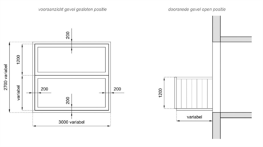 Dimensions (L x h) : 3 x 2,7 m, jusqu’à 1,3 m de profondeur en position déployée (maximales).