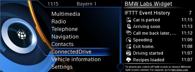 Grâce à ce partenariat, votre BMW est virtuellement capable d’interagir avec plus de 250 produits et services utilisant IFTTT. Pour y parvenir, il suffit d’activer le canal BMW Labs sur IFTTT et sélectionnez le Widget BMW Labs vertu BMW Widgets en ligne dans l’écran partagé de l’écran de contrôle de votre voiture. La mise en oeuvre est décrite ici.