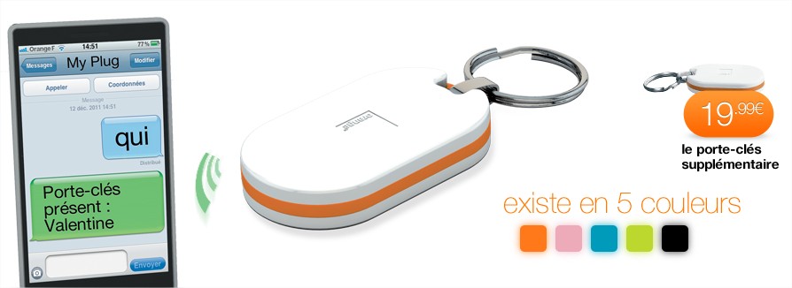 En complément du My Plug vous pouvez utiliser des porte-clés ayant la particularité de communiquer avec elle. Ce porte-clés astucieux est détecté par My Plug dès qu’il rentre ou qu’il sort de son champ de détection. Envoyez simplement le SMS « QUI» à la prise et My Plug vous répond s’il perçoit les porte-clés. Cela permet par exemple d’être informé de l’absence ou de la présence de vos proches. Les porte-clés sont disponibles en plusieurs couleurs.