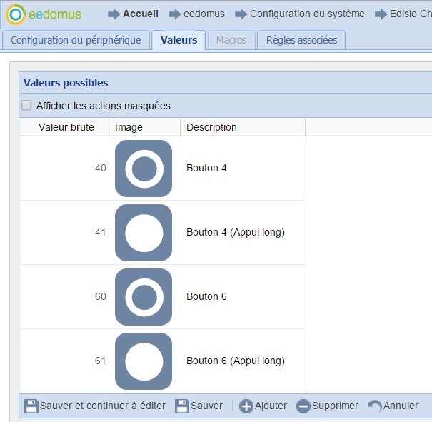 Pour pouvoir les utiliser dans des scénarii, les 8 boutons sont donc présents en tant que valeurs sur le périphérique Edisio créé dans la box eedomus.