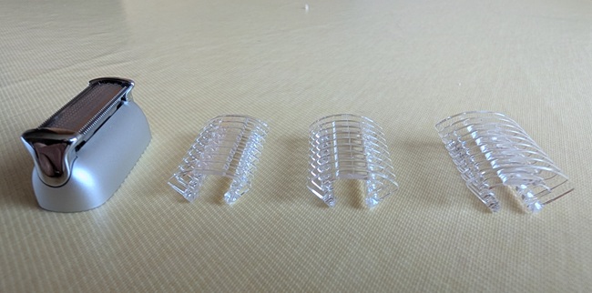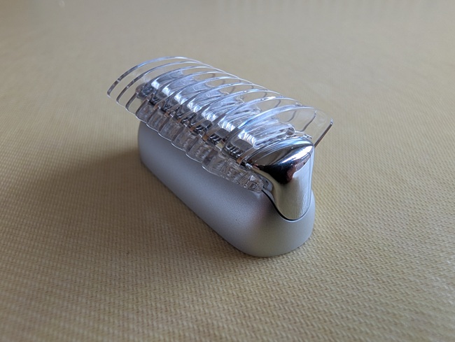 Les guides sont au nombre de 3 pour guider votre geste vers une taille de coupe de 2 mm, 3 mm ou 5 mm. J’aurais bien aimé une quatrième pouvant couper à 7 mm. Il n’y a malheureusement pas de sabots disponibles, même en option, pour ceux qui souhaitent une barbe plus longue.